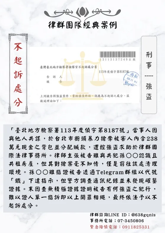 「臺北地方檢察署113年度偵字第8187號」當事人因與他人共謀,於台北市街頭暴力搶奪被害人內含238萬元現金之背包並分配贓款,遭控強盜求助於律群國際法律事務所。律師主張被告雖與共犯孫○○認識且共租房屋,但其對搶案毫不知情,僅是前往該處清理環境。孫○○雖指證被告透過Telegram群組以代號「鐵」下達指示,但警方調查通訊紀錄並未發現確鑿證據。末因查無積極證據證明被告有何強盜之犯行,難以證人單一指訴即以上開罪相繩,最終依法予以不起訴處分。