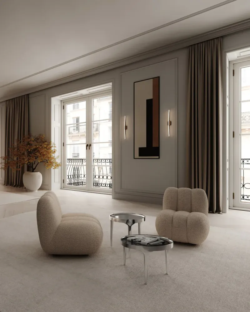 提供七種不同的面料選擇:天然質感的 Linen Chalk(亞麻);Bouclé面料帶來時尚且觸感豐富的三種顏色選項:米白、深褐和煙沙色;米白色的羊毛皮則呈現柔和且奢華的觸感;Sunproof Taupe適合耐污、防曬、防水環境;義大利磨面革 Nubuck 以精緻細膩的手工處理,擁有絲絨般的質感和高雅的感覺。