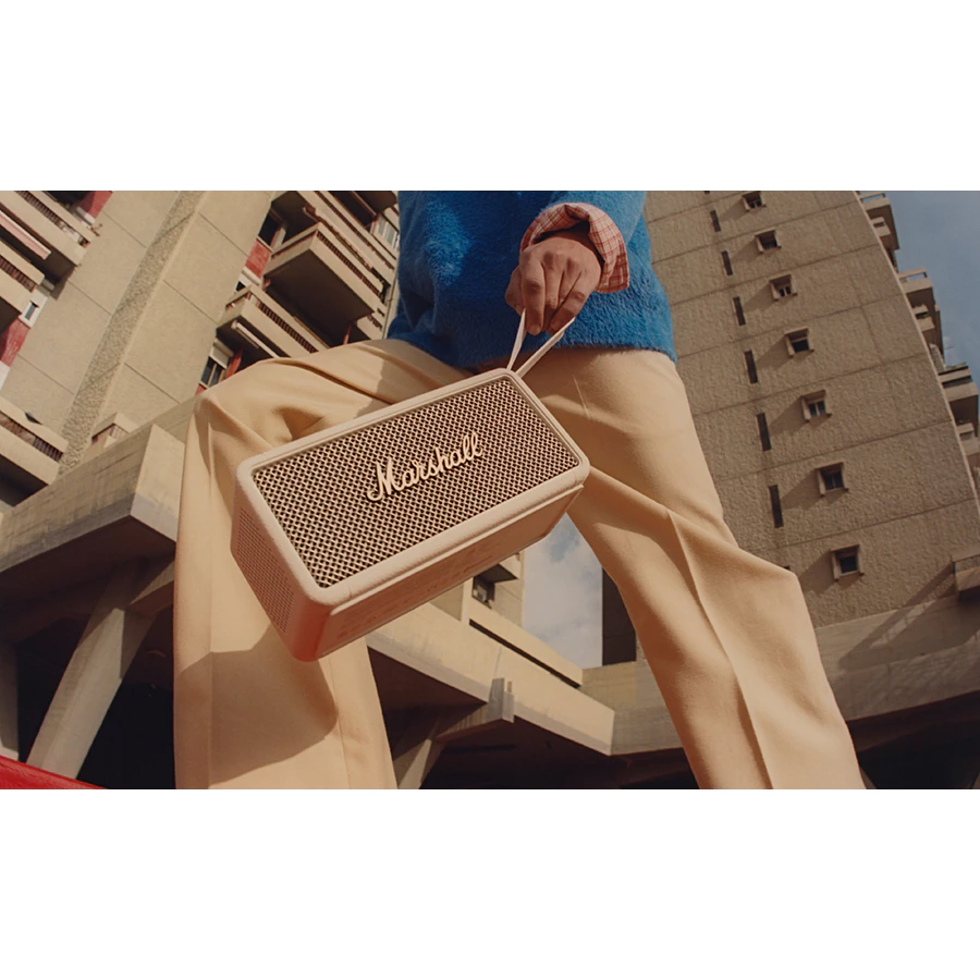 🔹Middleton隨身便攜,渾厚音質一路同行。採用四顆喇叭配置,隨行之處,都能獲得沉浸式的聆聽體驗。通過音箱頂部的控制按鈕或專屬應用程式,即可輕鬆播放音樂並調節高低音。内置的動態響度有助於調節聲音的音調平衡,確保在各種音量下都能呈現出色音質。
