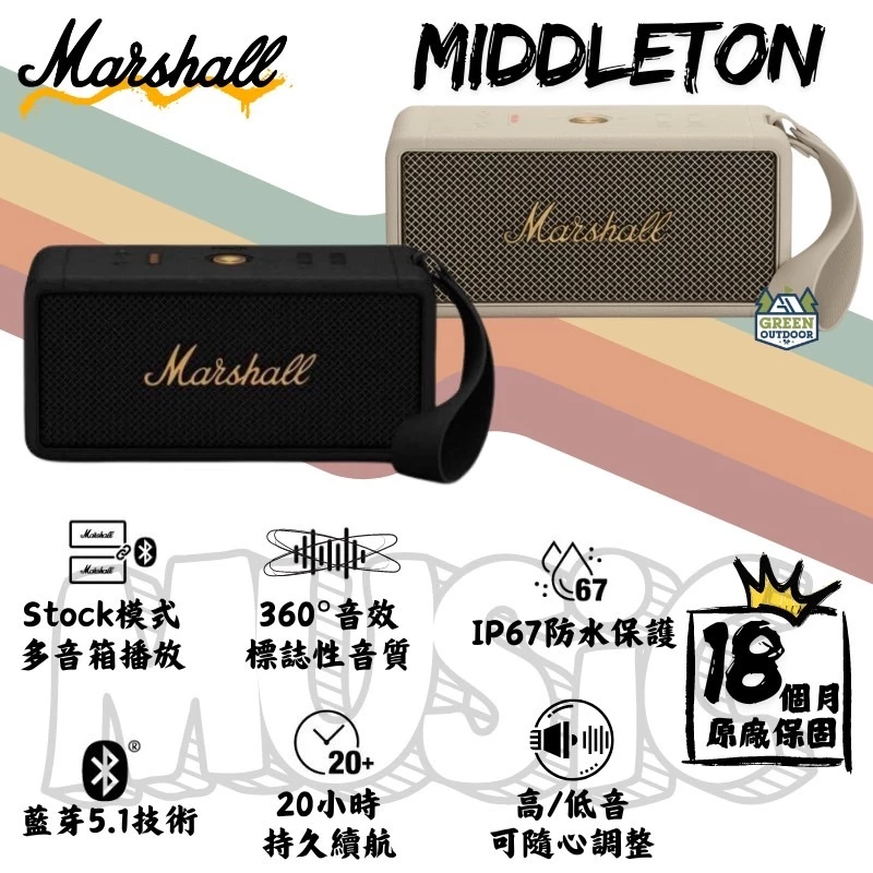 Marshall Middleton 【綠色工場】藍牙喇叭 攜帶式音響 藍芽音響 防水音響 手持式音響 藍芽喇叭