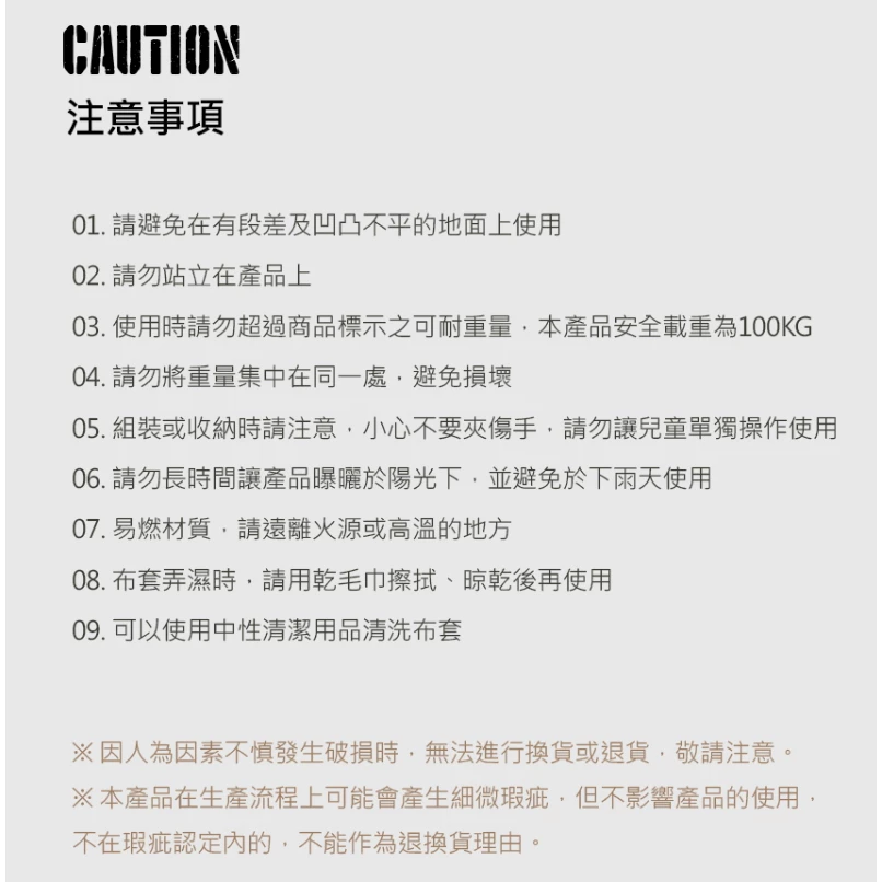 03.使用時請勿超過商品標示之可耐重量,本產品安全載重為100KG