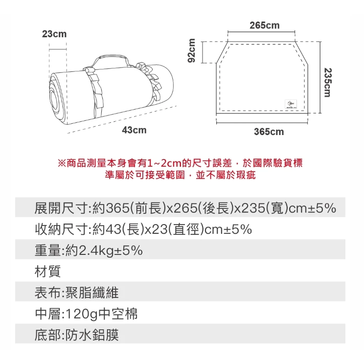 🔸展開尺寸:約365(前長)X265(後長)x235(寬)cm+5%
