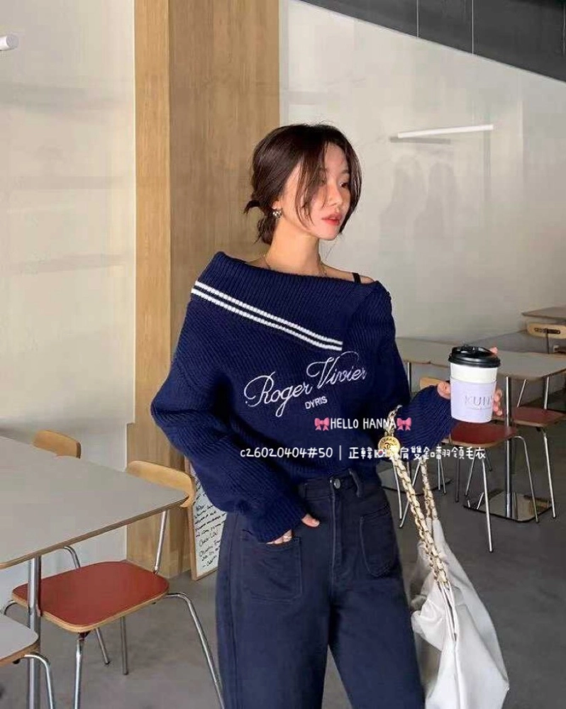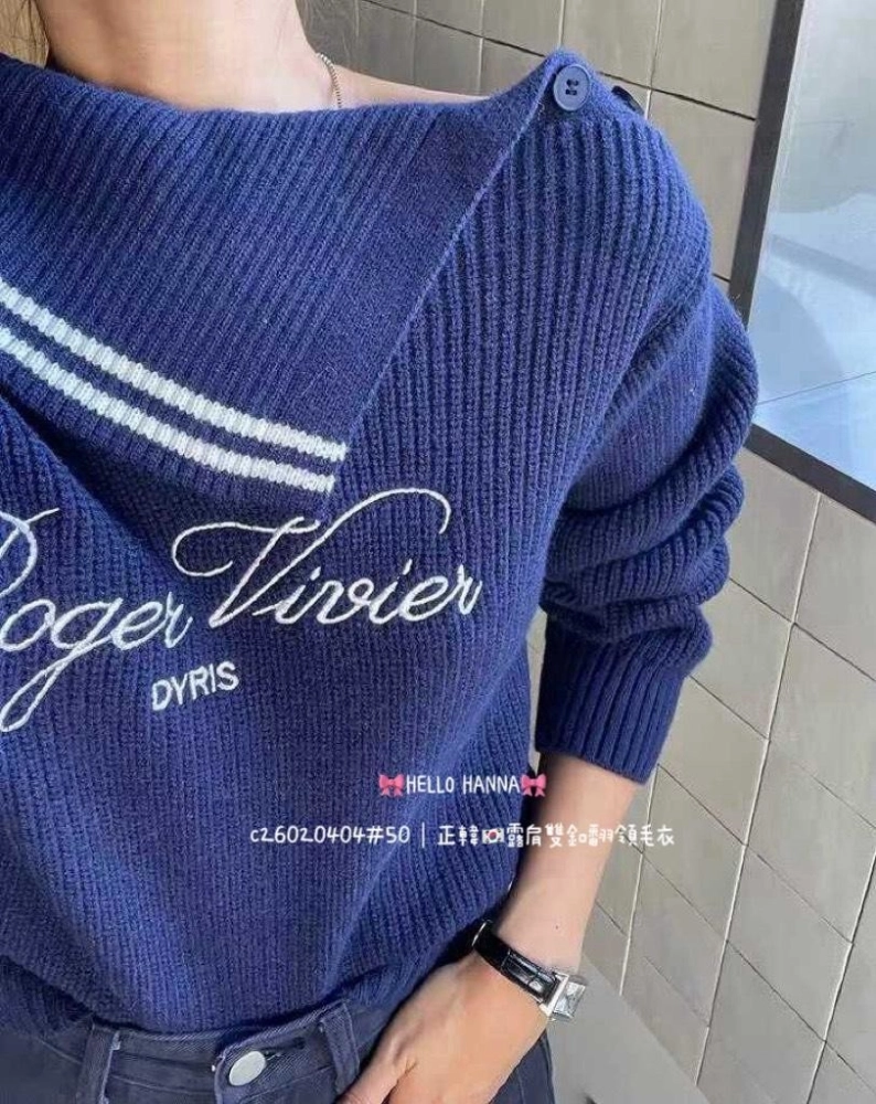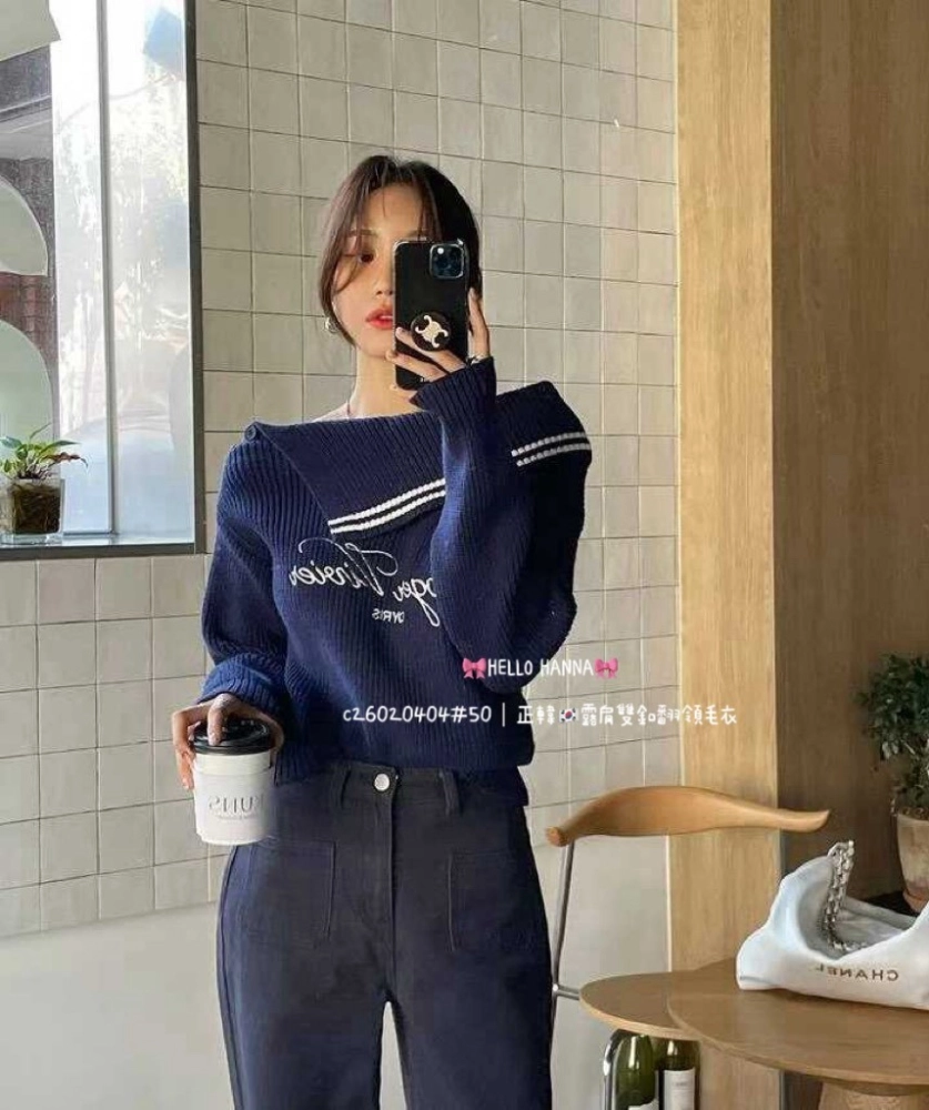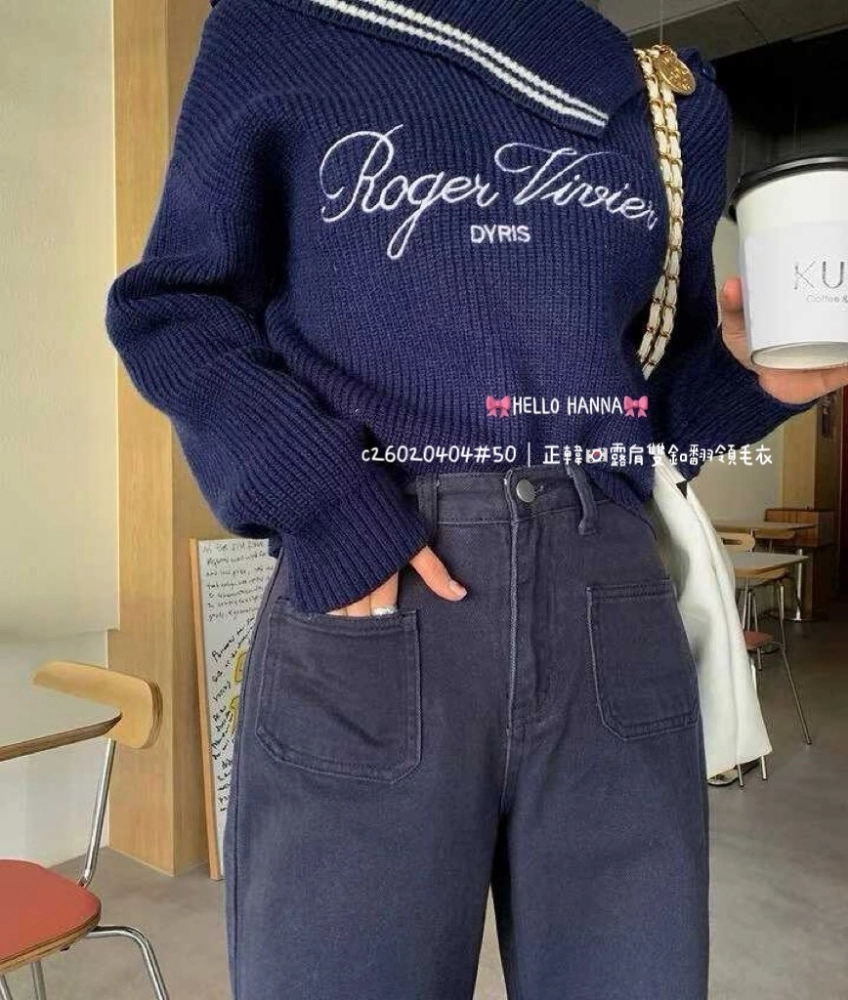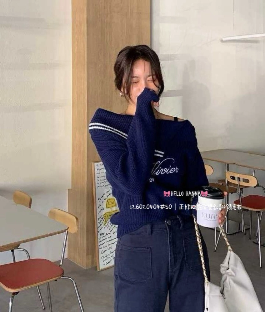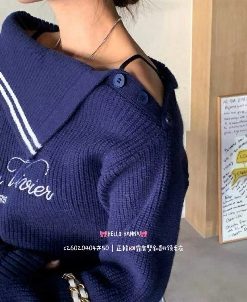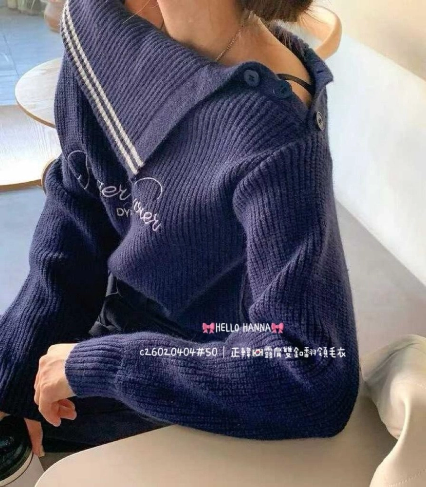 • 正韓露肩雙釦翻領毛衣