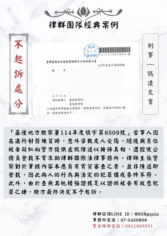 「基隆地方檢察署114年度偵字第6509號」當事人因在進行射箭練習時,意外導致友人受傷,隨後與另位被告疑似向警方提供虛假陳述以掩飾真相,遭控使公務員登載不實求助律群國際法律事務所。律師主張警察對於筆錄內容本應負有實質審查之責,並非陳述即登載,因此兩人的行為與法定的犯罪構成要件不符。此外,由於查無其他積極證據足以證明被告有故意犯罪之嫌,檢方最終決定不予起訴。