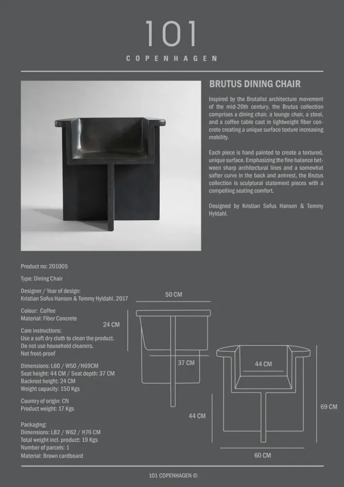 每件作品都是手工繪製的,以創造一個紋理、獨特的表面, Brutus系列強調了尖銳的建築線條與背部和扶手上稍柔軟的曲線之間的微妙平衡,是具有引人注目的舒適座椅的雕塑作品。