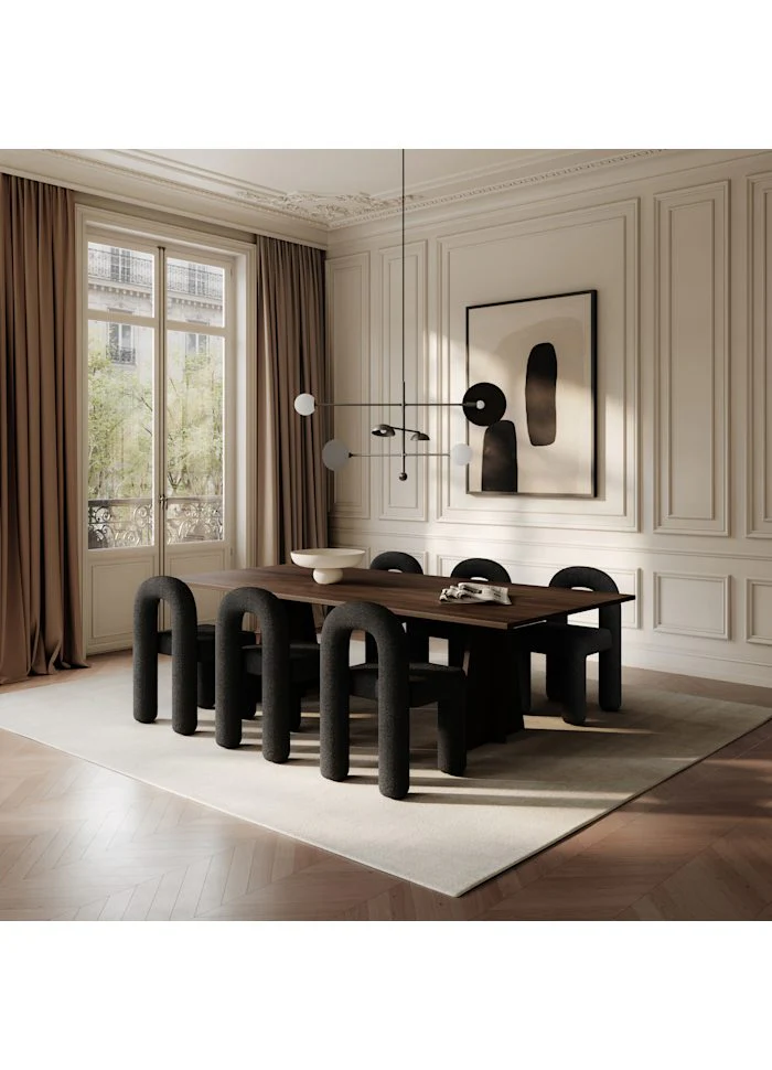 椅子的幾何純粹性,為餐桌空間帶來精緻的建築感;而其開放且邀請式的造型,則在用餐時營造出舒適與社交連結的氛圍。結構上採用精心層疊的泡棉,搭配柔和圓潤的邊角設計,在嚴謹的幾何造型與柔和的觸感之間取得完美平衡。可見的縫線極少,強化了其俐落簡約的風格。