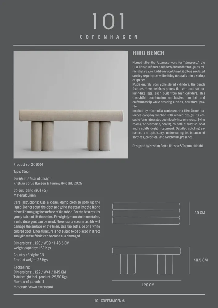 本款採用 Linen 亞麻布料包覆,呈現柔和的金米色調,帶有彷彿陽光灑落般的溫暖氣息,令人聯想到海岸沙丘與明亮海岸線。天然亞麻材質營造出輕盈且不造作的中性色調,細微的色澤變化豐富了觸感層次,並隨著時間與使用逐漸展現更加柔軟迷人的質感。無論放置於玄關、臥室或客廳空間,Hiro 長椅都能為空間帶來內斂優雅的氛圍、溫潤質感與歷久彌新的工藝美學。