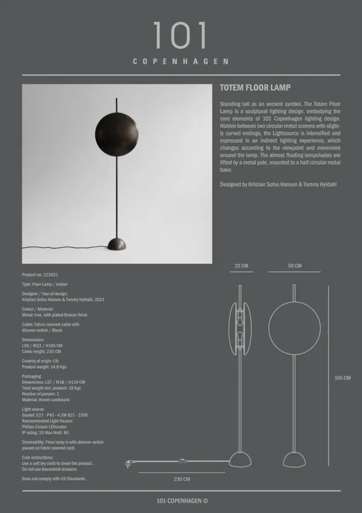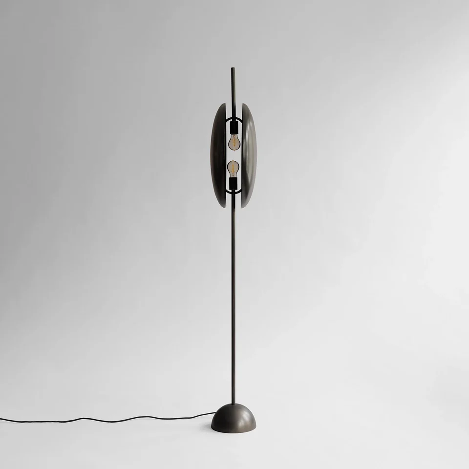 如同古老的象徵矗立而立,圖騰落地燈是一款極具雕塑感的燈具設計,展現 101 Copenhagen 照明設計的核心美學。燈光源隱藏於兩片圓形金屬遮板之間,遮板邊緣略帶弧度,使光線被柔和地增強,營造出間接照明的效果,隨著觀賞角度與移動而呈現不同的光影變化。