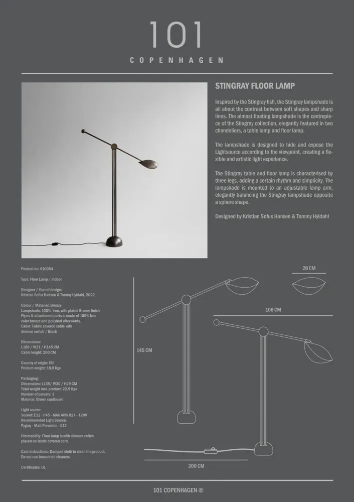 Stingray檯燈和落地燈的特點是由三根支座支撐,增添了一定的韻律和簡潔感。燈罩安裝在可調節燈臂上,優雅地平衡 Stingray 燈罩與球形。