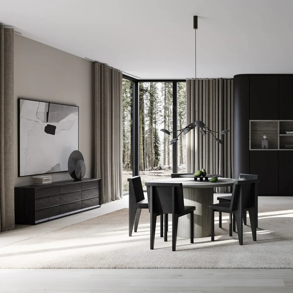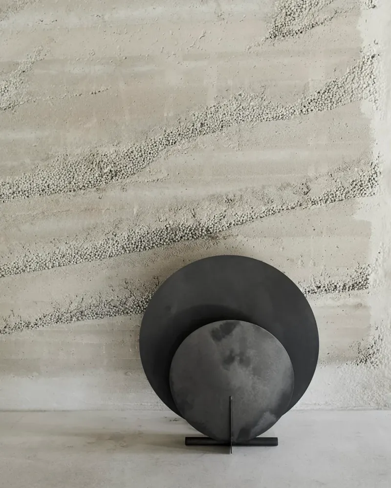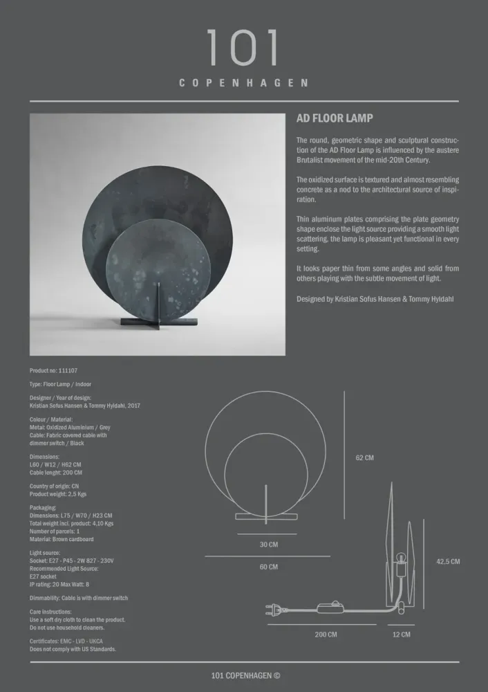 AD 落地燈的圓形幾何形狀和雕塑結構受到 20 世紀中葉樸素的野獸派運動的影響。氧化表面具有紋理,幾乎類似於混凝土,以此向建築靈感來源致敬。由板幾何形狀組成的薄鋁板包圍光源,提供平滑的光散射,該燈在任何環境下都令人愉悅且實用。