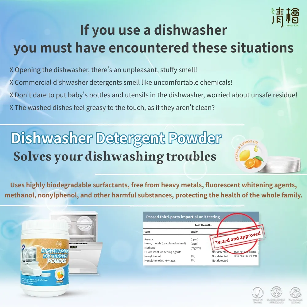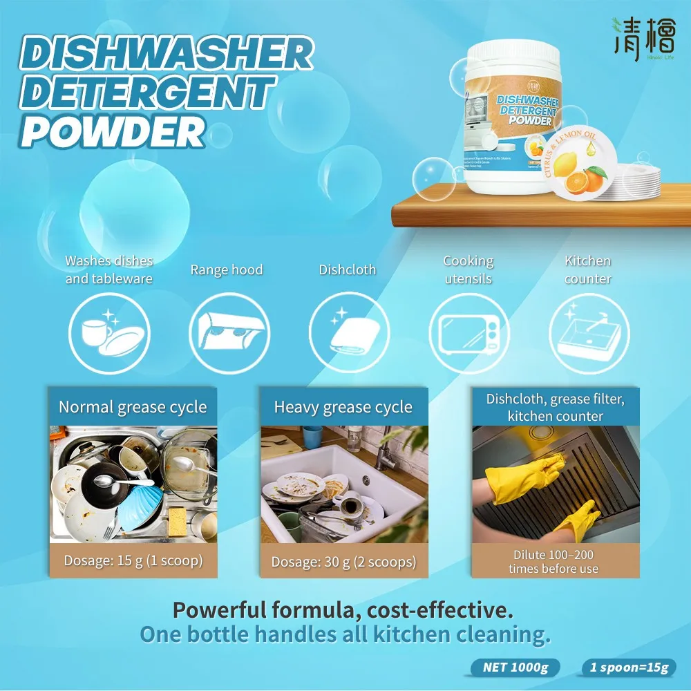 Instructions for Use: Pour the dishwashing powder into the dedicated detergent compartment of the dishwasher. For general soiling, the recommended dosage is one scoop (15g) per wash. The amount can be adjusted according to the level of soiling on the dishes. The included scoop has a capacity of 15g. For cleaning dishcloths, grease filters, and kitchen counters: Use diluted 100-200 times. For example, add 10g of dishwashing powder to 1 liter of water for dilution and soaking use.