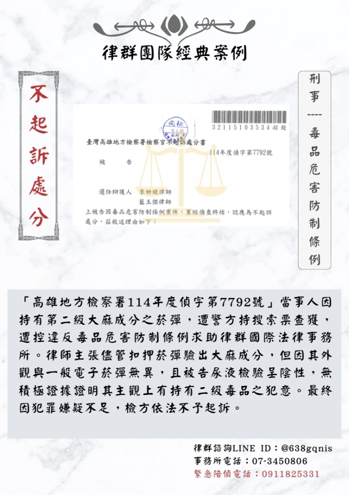 「高雄地方檢察署114年度偵字第7792號」當事人因持有第二級大麻成分之菸彈,遭警方持搜索票查獲,遭控違反毒品危害防制條例。律師主張儘管扣押菸彈驗出大麻成分,但因其外觀與一般電子菸彈無異,且被告尿液檢驗呈陰性,無積極證據證明其主觀上有持有二級毒品之犯意。最終因犯罪嫌疑不足,檢方依法不予起訴。