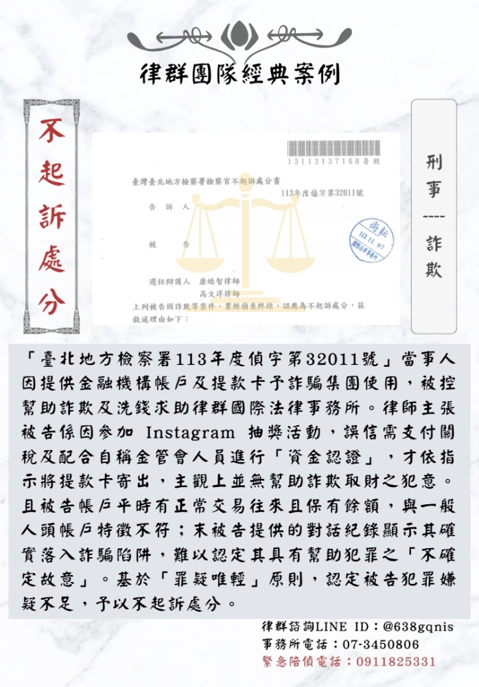 「臺北地方檢察署113年度偵字第32011號」當事人因提供金融機構帳戶及提款卡予詐騙集團使用,被控幫助詐欺及洗錢求助律群國際法律事務所。律師主張被告係因參加 Instagram 抽獎活動,誤信需支付關稅及配合自稱金管會人員進行「資金認證」,才依指示將提款卡寄出,主觀上並無幫助詐欺取財之犯意。且被告帳戶平時有正常交易往來且保有餘額,與一般人頭帳戶特徵不符;末被告提供的對話紀錄顯示其確實落入詐騙陷阱,難以認定其具有幫助犯罪之「不確定故意」。基於「罪疑唯輕」原則,認定被告犯罪嫌疑不足,予以不起訴處分。