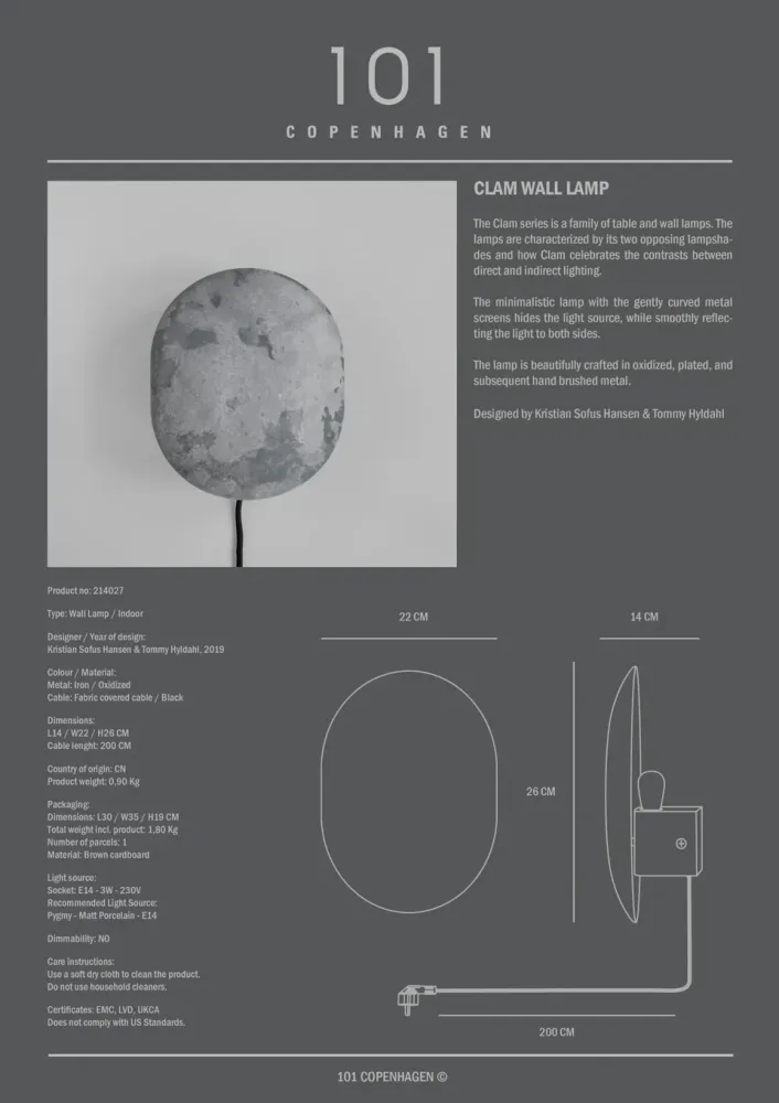 Clam 系列特點是為 其兩種相反的色調可以玩轉於直接和間接照明。這盞極簡主義的燈將光線平滑地反射到柔和彎曲的金屬屏幕的兩側。採用氧化、電鍍和隨後的手工拉絲金屬製成,製作精美。