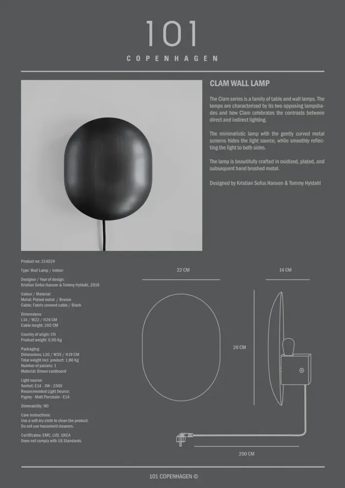 Clam 系列特點是為 其兩種相反的色調可以玩轉於直接和間接照明。這盞極簡主義的燈將光線平滑地反射到柔和彎曲的金屬屏幕的兩側。採用氧化、電鍍和隨後的手工拉絲金屬製成,製作精美。