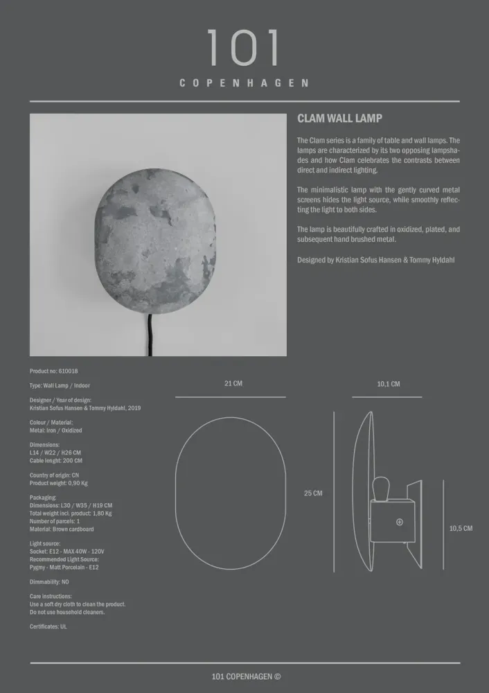 Clam 系列特點是為 其兩種相反的色調可以玩轉於直接和間接照明。這盞極簡主義的燈將光線平滑地反射到柔和彎曲的金屬屏幕的兩側。採用氧化、電鍍和隨後的手工拉絲金屬製成,製作精美。