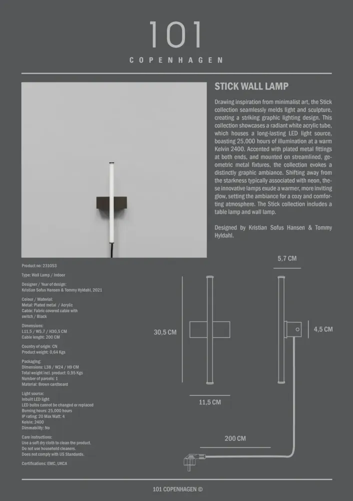 Stick系列汲取極簡主義藝術的靈感,將光源與雕塑無縫結合,創造出引人注目的圖形燈光設計。此系列展示了光澤白色的壓克力管,內含長效LED光源,提供長達25,000小時的照明,色溫為2400K的暖光。兩端配有鍍金屬配件並安裝在流線型幾何金屬架上,營造出鮮明的圖形氛圍。與傳統霓虹燈的強烈對比,這些創新燈具散發出更溫暖、誘人的光輝,營造出舒適宜人的氛圍。