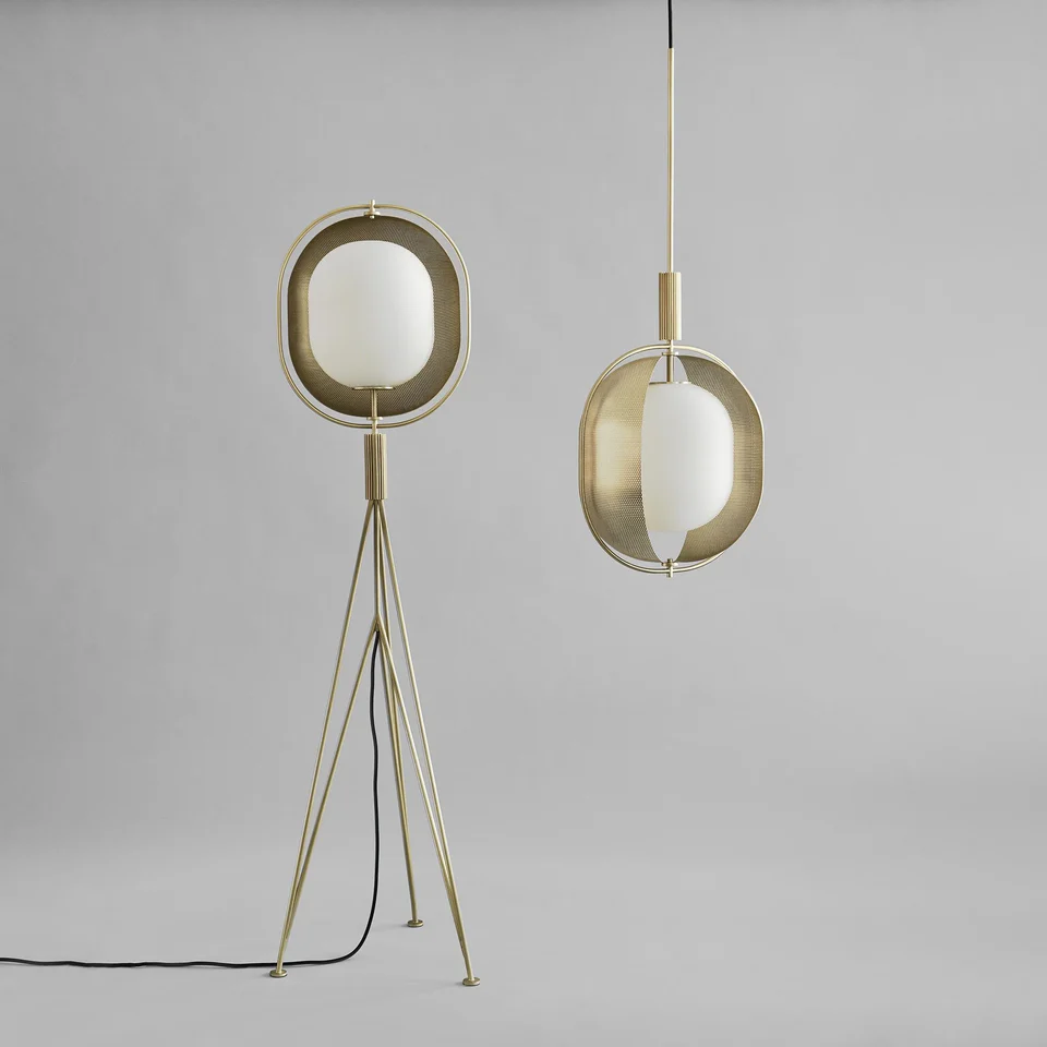 燈體懸掛於簡約雕塑感十足的金屬結構中,呈現出幾近無重力的視覺效果。燈具採用鍍金屬處理並經過手工拉絲,有吊燈和落地燈可供選擇。