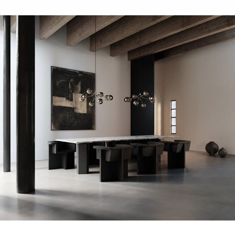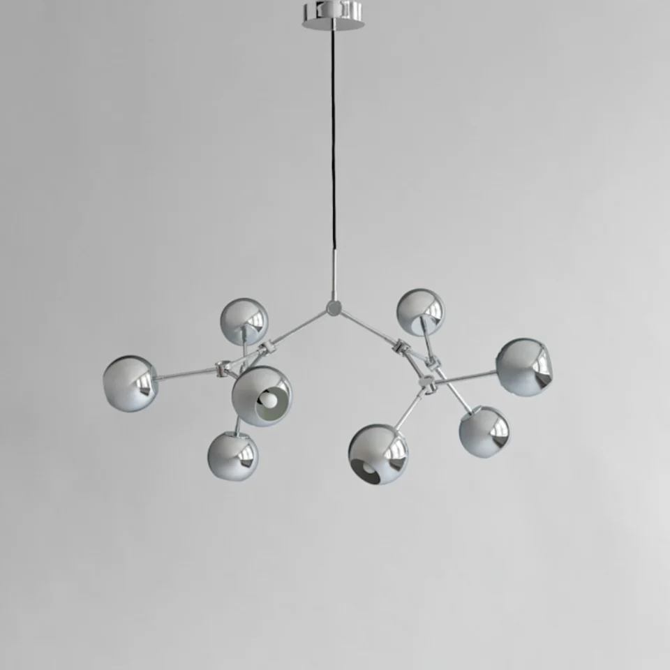 這款吊燈的魅力不僅在於外觀,更在於其 14 支可調節的金屬燈臂。