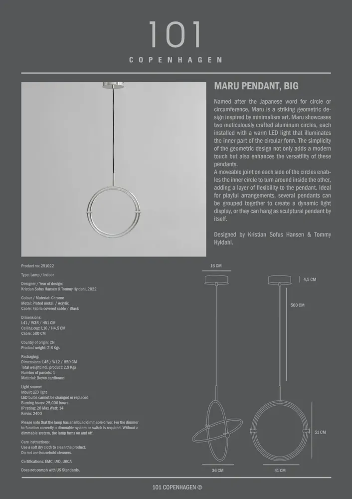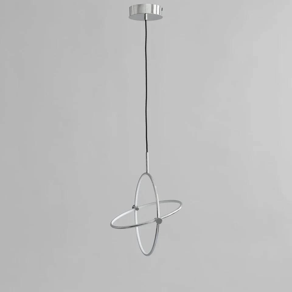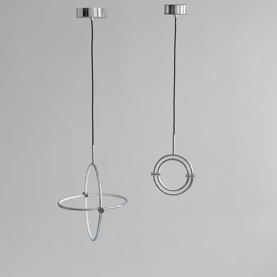 Maru 以日文中「圓形」或「周邊」為名,這款吊燈受到極簡藝術啟發的幾何設計。它由兩個精緻製作的鋁圈組成,每個圈內安裝了溫暖的 LED 燈,照亮圓形內部。兩個圓圈的移動接頭設計使內圈能夠在外圈內旋轉,為吊燈增添靈活性。