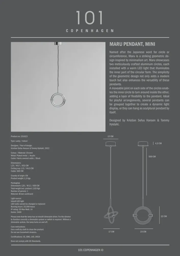 Maru 以日文中「圓形」或「周邊」為名,這款吊燈受到極簡藝術啟發的幾何設計。它由兩個精緻製作的鋁圈組成,每個圈內安裝了溫暖的 LED 燈,照亮圓形內部。兩個圓圈的移動接頭設計使內圈能夠在外圈內旋轉,為吊燈增添靈活性。