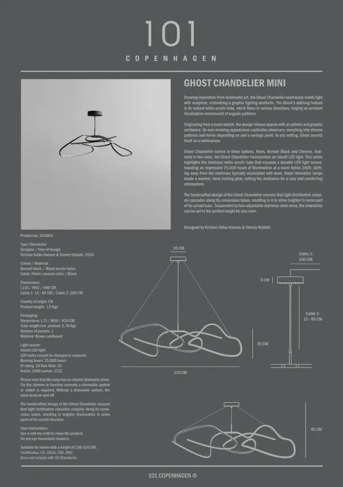 受到極簡藝術啟發,巧妙地將光線與雕塑融合,體現圖形化的照明美學。幽靈吊燈的核心特徵是其輻射狀的白色壓克力燈管,光線從中向不同方向流動,營造出類似有機圖案的環境光。從手繪草圖起源,設計賦予空間藝術感和圖形氛圍,觀察角度不同,外觀不斷變化,成為空間的視覺焦點。