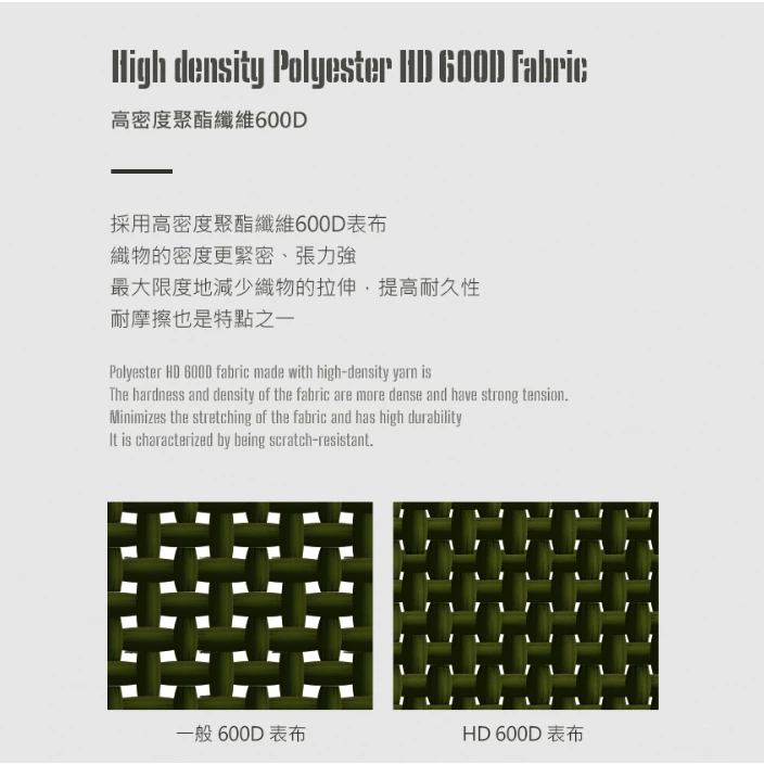 🔹採用高密度聚酯纖維600D表布,織物的密度更緊密、張力強,最大限度地減少織物的拉伸,提高耐久性