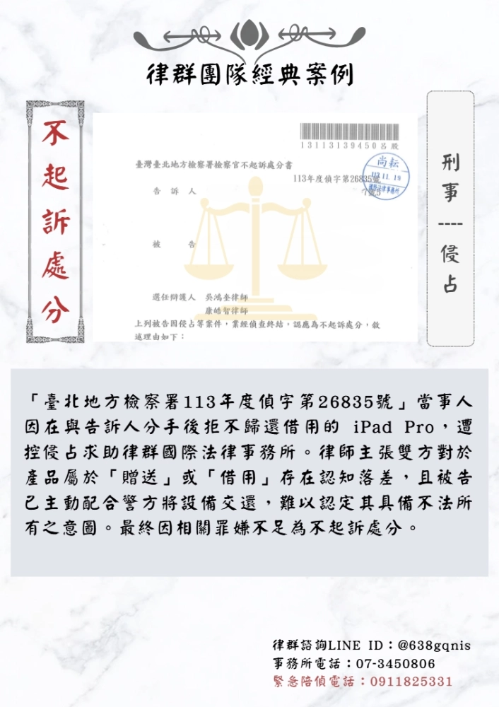 「臺北地方檢察署113年度偵字第26835號」當事人因在與告訴人分手後拒不歸還借用的 iPad Pro,遭控侵占求助律群國際法律事務所。律師主張雙方對於產品屬於「贈送」或「借用」存在認知落差,且被告已主動配合警方將設備交還,難以認定其具備不法所有之意圖。最終因相關罪嫌不足為不起訴處分。