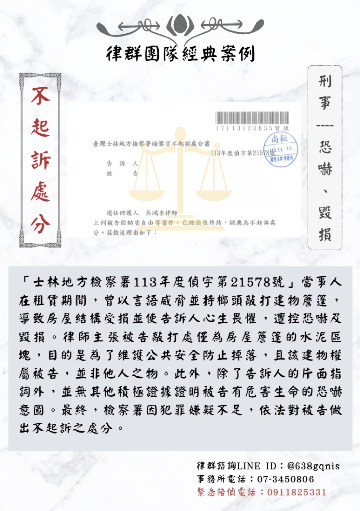 「士林地方檢察署113年度偵字第21578號」當事人在租賃期間,曾以言語威脅並持榔頭敲打建物簷篷,導致房屋結構受損並使告訴人心生畏懼,遭控恐嚇及毀損。律師主張被告敲打處僅為房屋簷篷的水泥區塊,目的是為了維護公共安全防止掉落,且該建物權屬被告,並非他人之物。此外,除了告訴人的片面指詞外,並無其他積極證據證明被告有危害生命的恐嚇意圖。最終,檢察署因犯罪嫌疑不足,依法對被告做出不起訴之處分。