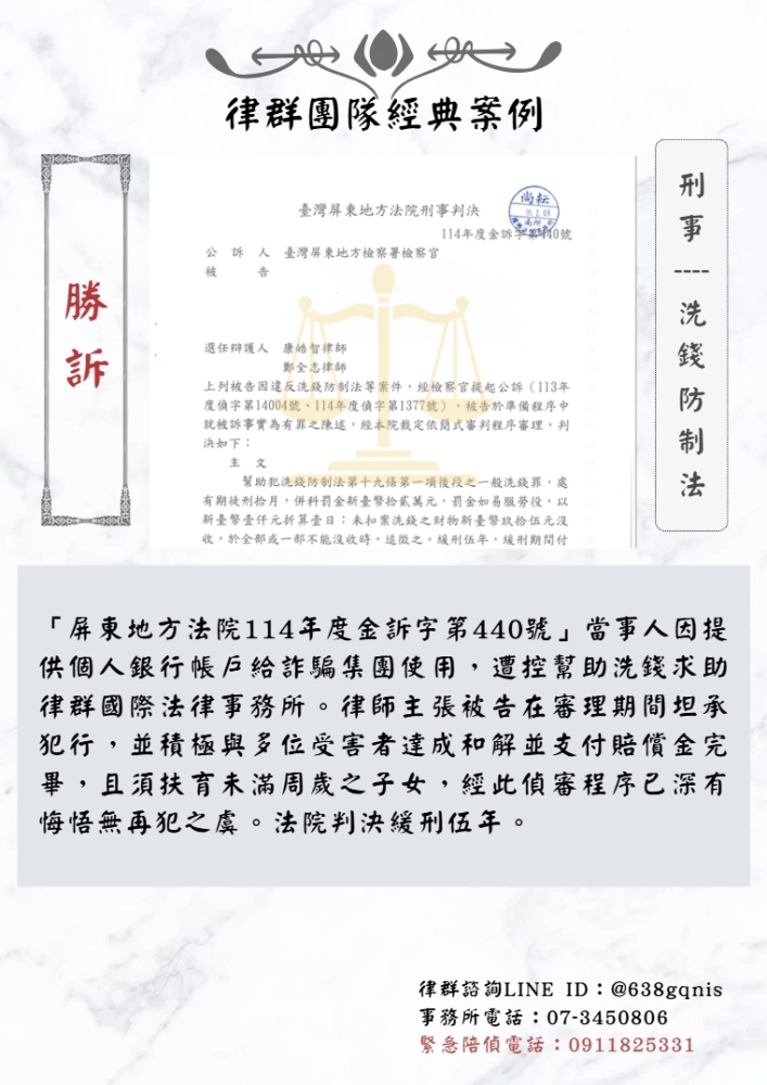 「屏東地方法院114年度金訴字第440號」當事人因提供個人銀行帳戶給詐騙集團使用,遭控幫助洗錢求助律群國際法律事務所。律師主張被告在審理期間坦承犯行,並積極與多位受害者達成和解並支付賠償金完畢,且須扶育未滿周歲之子女,經此偵審程序已深有悔悟無再犯之虞。法院判決緩刑伍年。