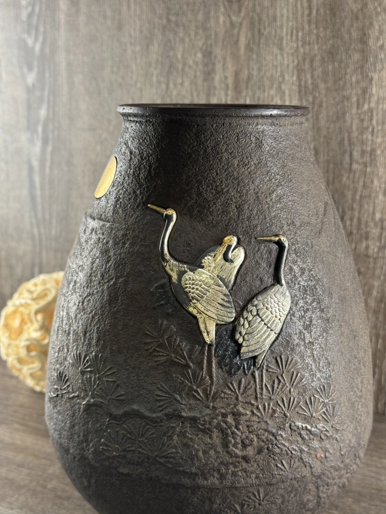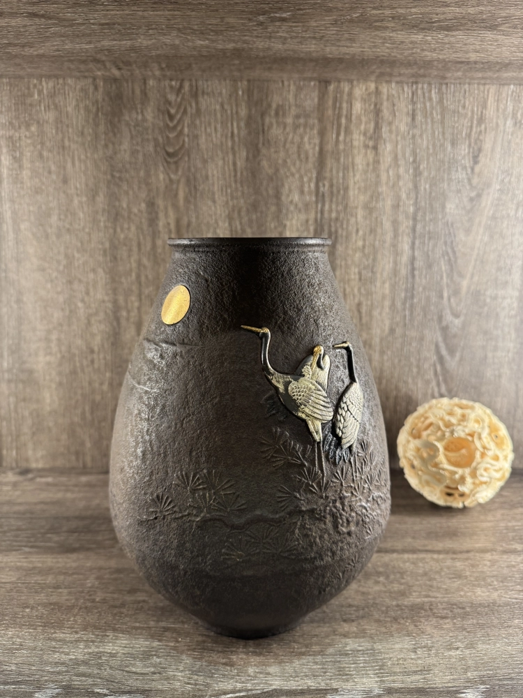 明治時期 鐵製金銀象嵌鶴松圖花瓶