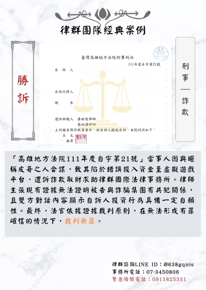 「高雄地方法院111年度自字第21號」當事人因與暱稱皮哥之人合謀,致其陷於錯誤投入資金至虛擬遊戲平台,遭訴詐欺取財求助律群國際法律事務所。律師主張現有證據無法證明被告與詐騙集團有共犯關係,且雙方對話內容顯示自訴人投資行為具備一定自願性。最終,法官依據證據裁判原則,在無法形成有罪確信的情況下,裁判被告無罪。
