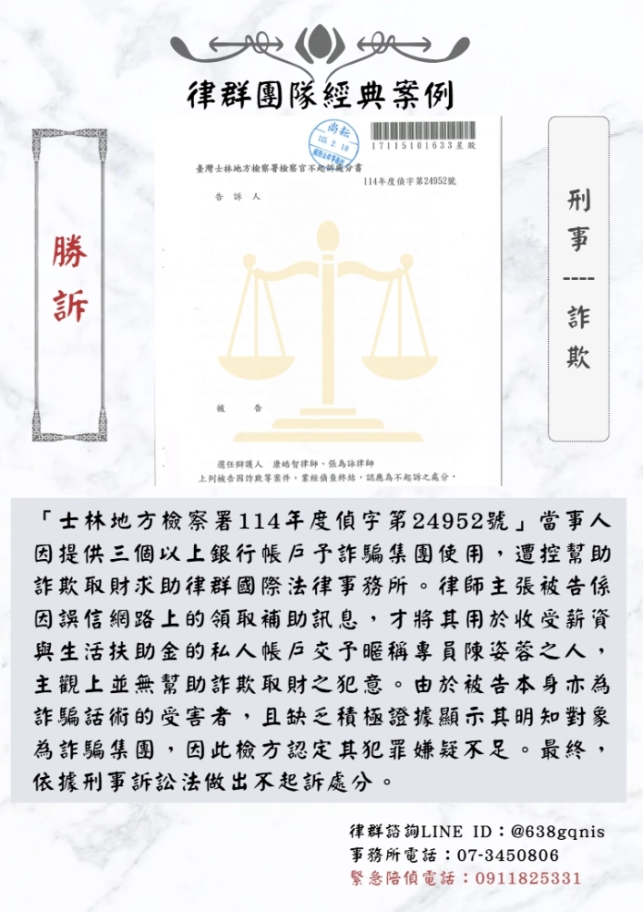 「士林地方檢察署114年度偵字第24952號」當事人因提供三個以上銀行帳戶予詐騙集團使用,遭控幫助詐欺取財求助律群國際法律事務所。律師主張被告係因誤信網路上的領取補助訊息,才將其用於收受薪資與生活扶助金的私人帳戶交予暱稱專員陳姿蓉之人,主觀上並無幫助詐欺取財之犯意。由於被告本身亦為詐騙話術的受害者,且缺乏積極證據顯示其明知對象為詐騙集團,因此檢方認定其犯罪嫌疑不足。最終,依據刑事訴訟法做出不起訴處分。