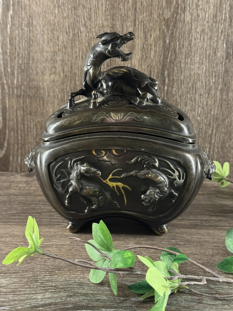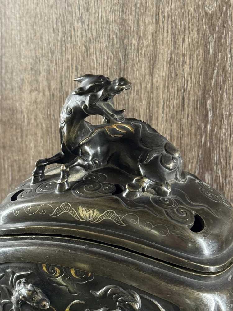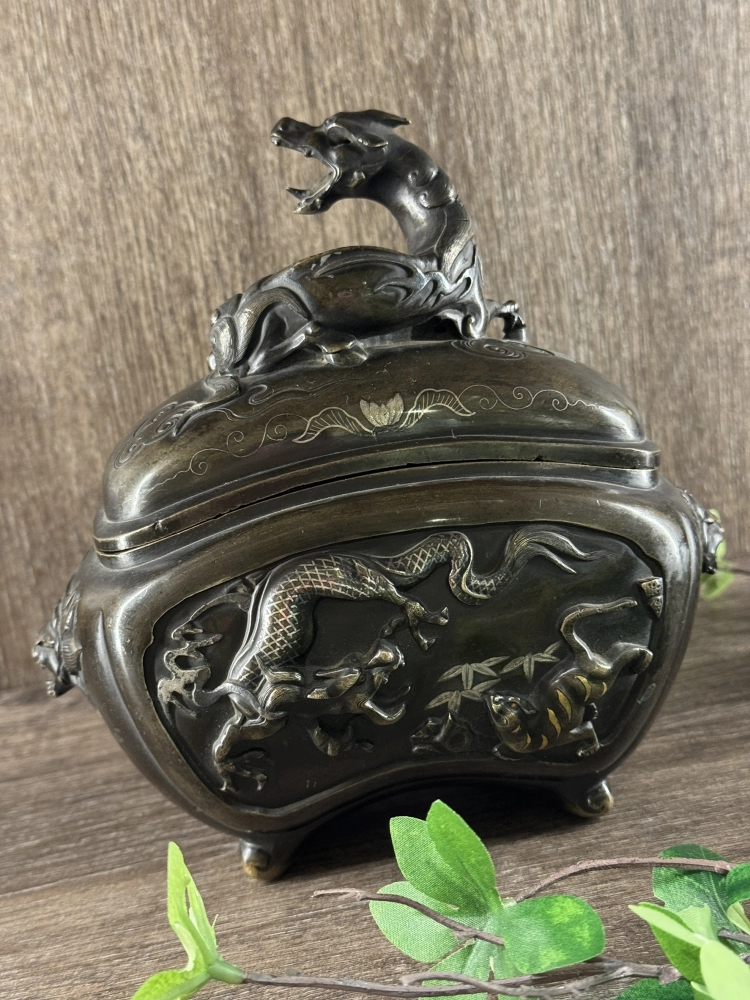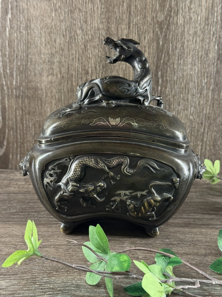 明治時期 銅製象嵌龍虎香爐