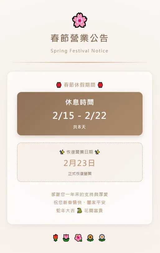🧧春節期間🧧  2/15-2/22 共8天店休