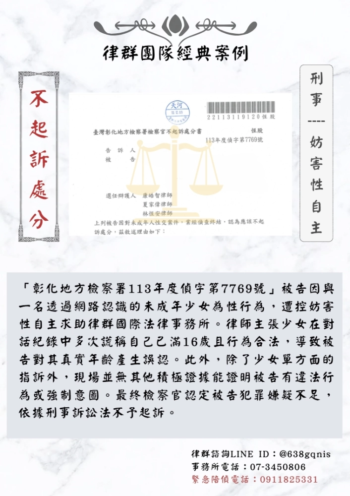 「彰化地方檢察署113年度偵字第7769號」被告因與一名透過網路認識的未成年少女為性行為,遭控妨害性自主求助律群國際法律事務所。律師主張少女在對話紀錄中多次謊稱自己已滿16歲且行為合法,導致被告對其真實年齡產生誤認。此外,除了少女單方面的指訴外,現場並無其他積極證據能證明被告有違法行為或強制意圖。最終檢察官認定被告犯罪嫌疑不足,依據刑事訴訟法不予起訴。