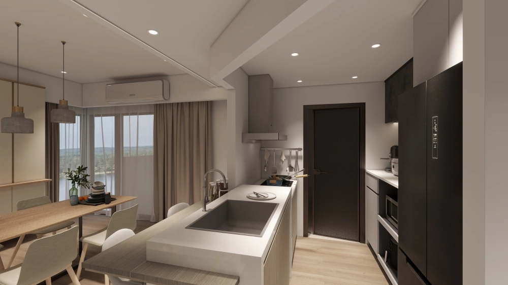 開放式廚房與中島緊密串聯,創造出視線無阻礙的流動感,讓烹飪不再是孤島,而