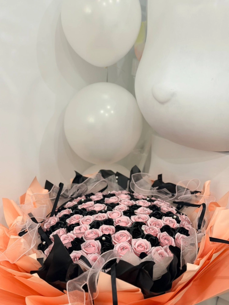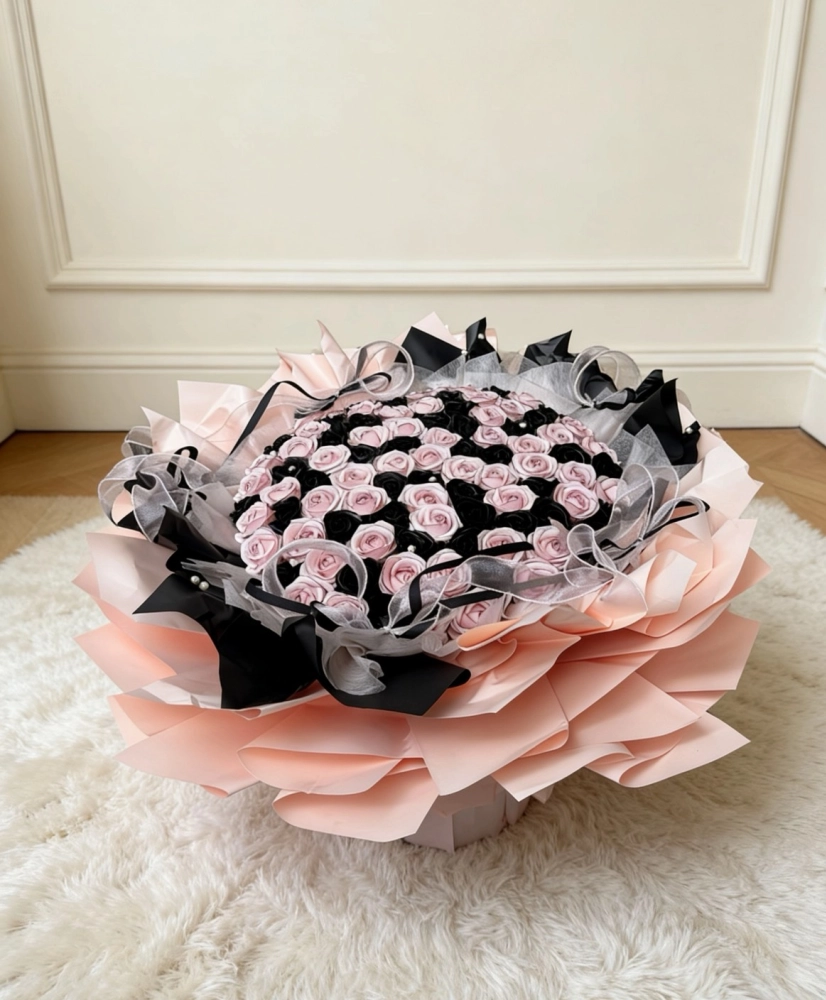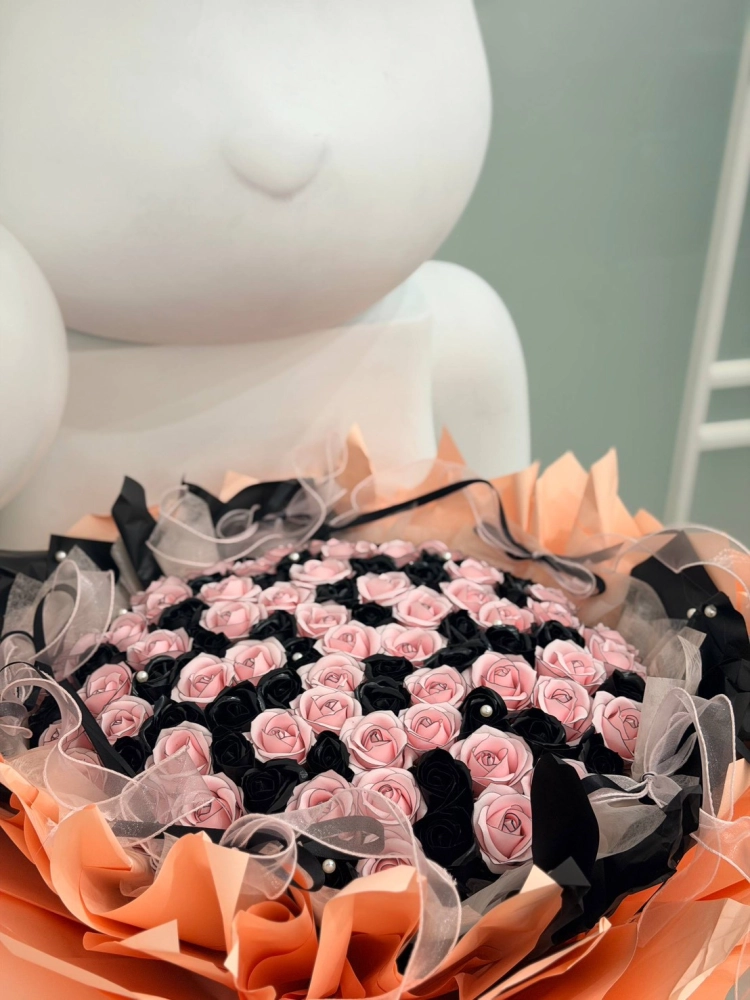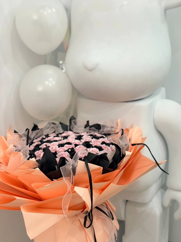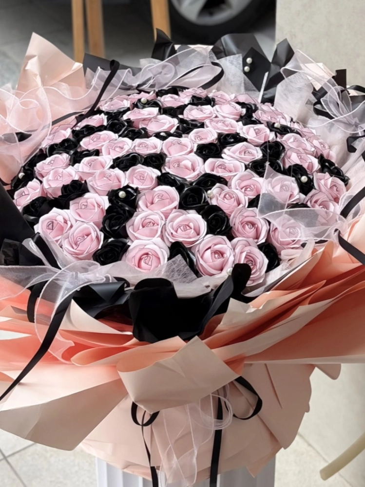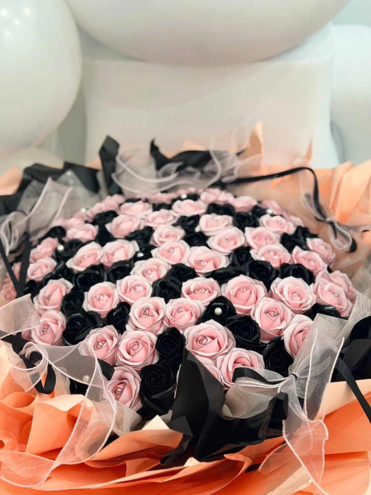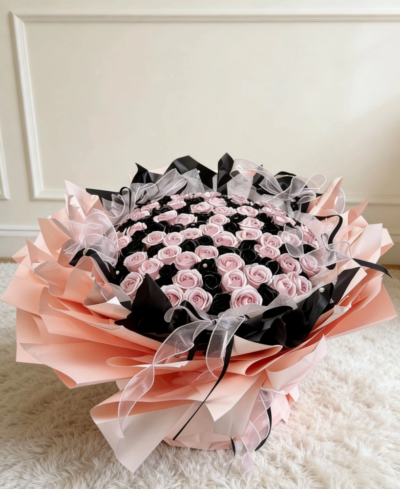 花語 :看這粉與黑交織的玫瑰,如愛情的雙面—粉是初見的羞赧,黑是深戀的沉斂。蜜桃色的包裝如晨曦的薄紗,將溫柔與神祕緊緊包裹,告訴世人:真正的愛,既能如粉玫瑰般柔軟,也能如黑玫瑰般堅定,在矛盾與和諧中,綻放出最動人的詩篇。」