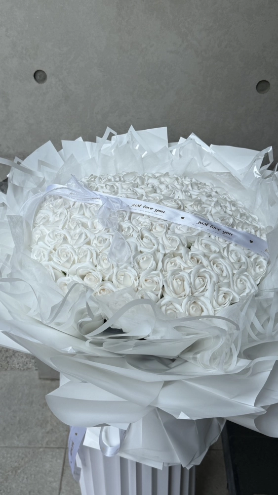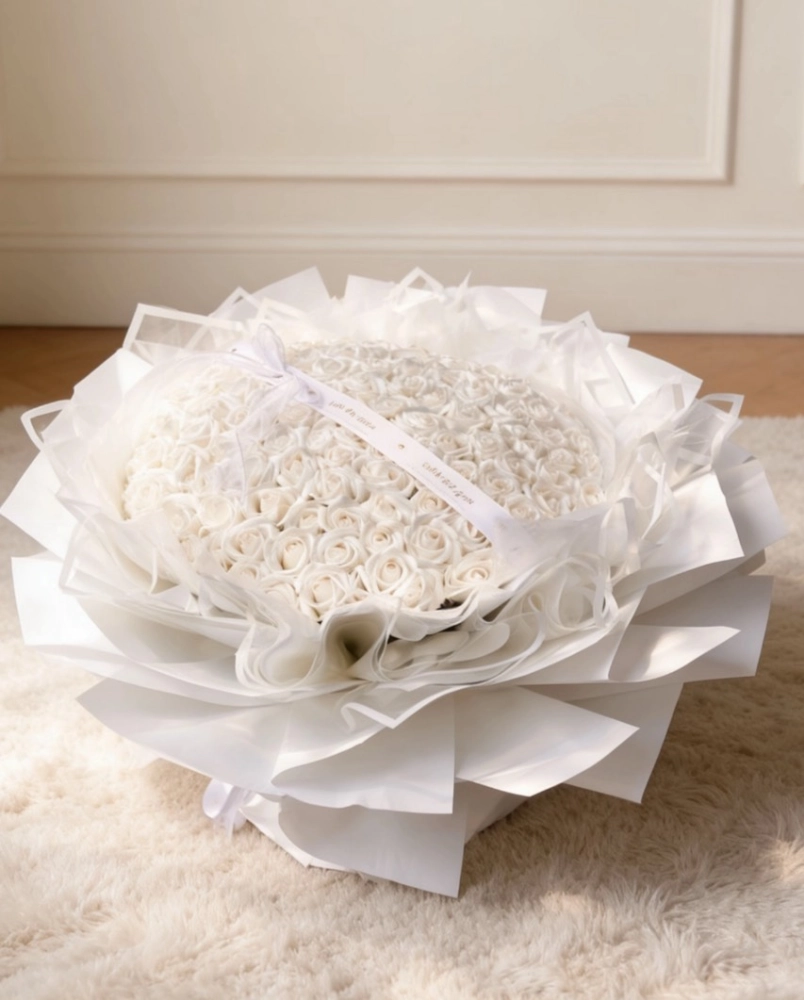 花語 :愛情是一場純白的儀式,它讓我們在無瑕中許下諾言,在輕柔中守護真摯。這束花,便是這場儀式的見證—白玫瑰的純淨包裹著白紗的飄逸,緞帶的誓言點綴其間,每一片花瓣,都是我對你永不褪色的忠貞