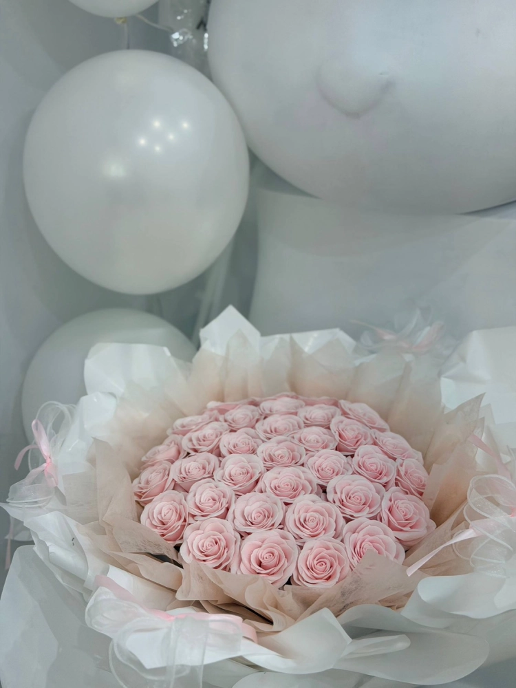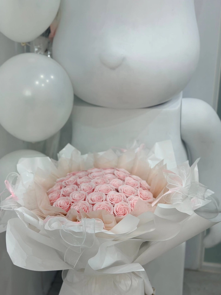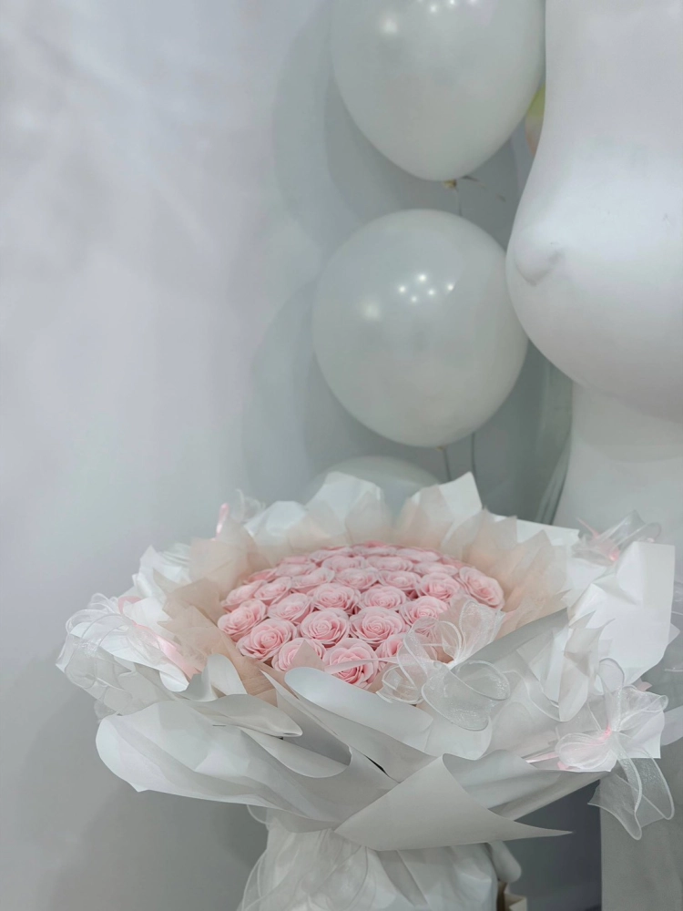 「愛情是一場美麗的羞赧,它讓我們在純真中帶點悸動,在輕柔中藏點羞赧。這束花,便是這場羞赧的見證—白紙的純淨包裹著粉玫瑰的羞赧,蝶結的纏綿中,是我對你最真實的愛。」