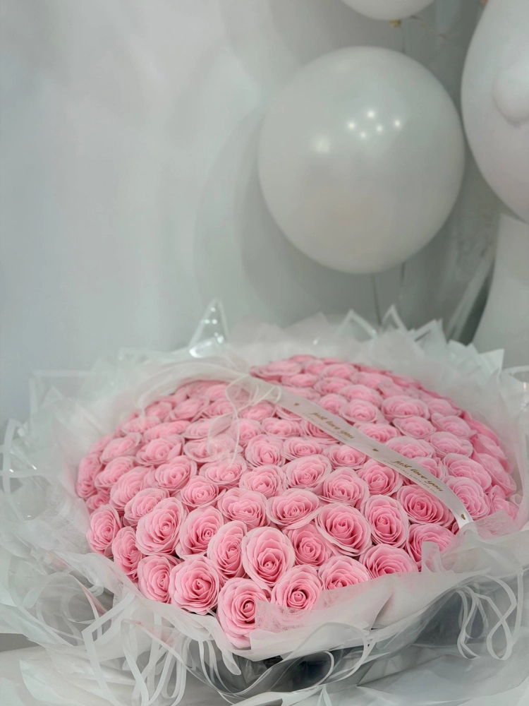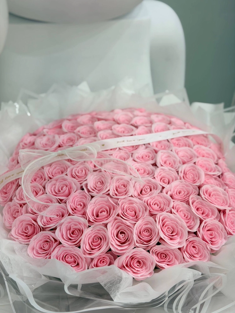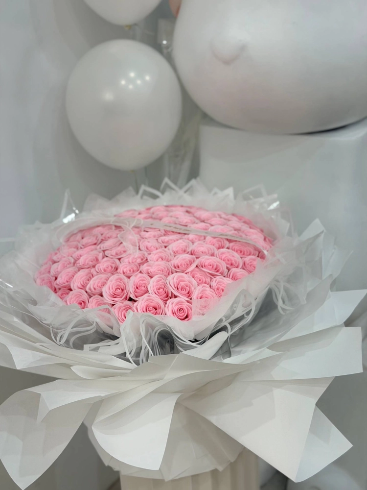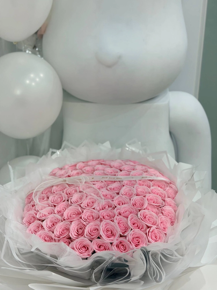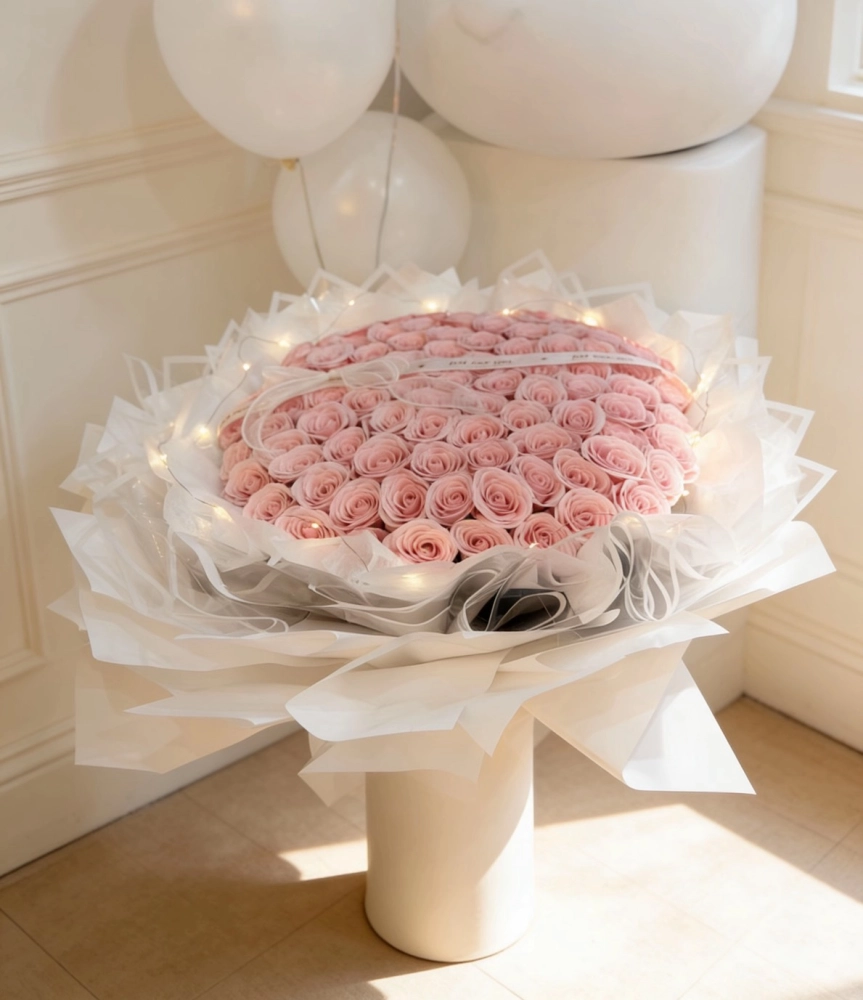 花語 :「在這如夢似幻的白紗下,是一顆被春霧浸潤的粉心,緞帶的星芒點綴其間。那飄逸的白紗,是我派去守護你的精靈,它告訴我:愛情不必昭然若揭,也可以像霧中花一樣,在朦朧裡藏著最深的意。」