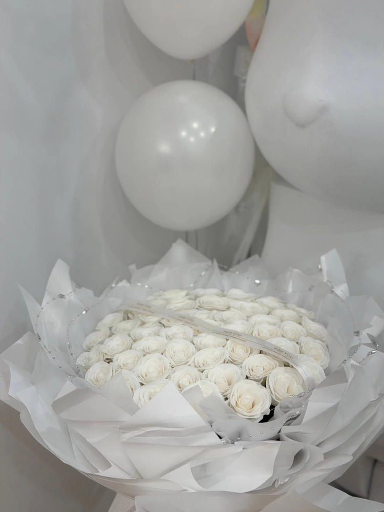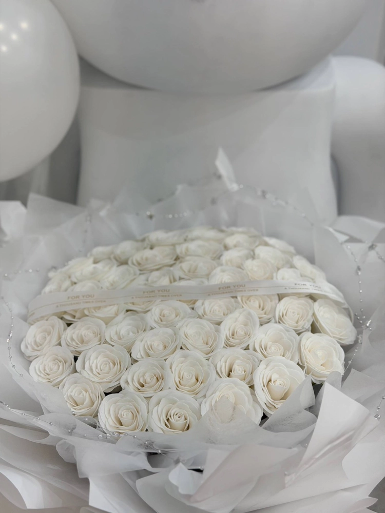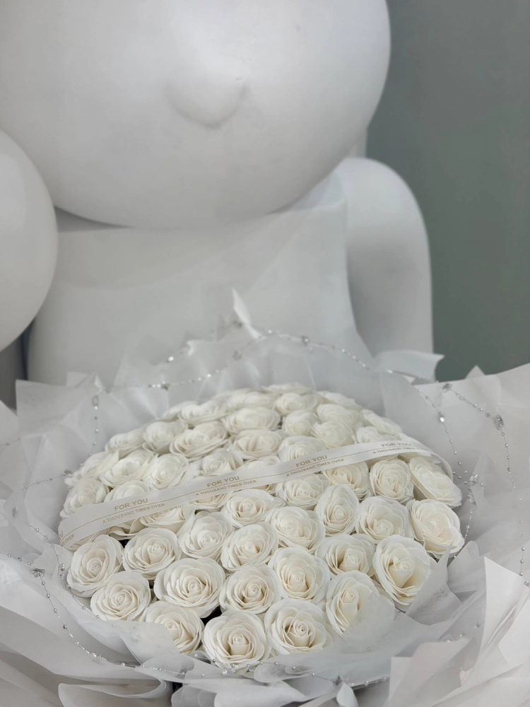 花語:「愛情是一場千次的重複,它讓我們在無瑕中許下諾言,在璀璨中守護真摯。這束花,便是這場重複的見證—白玫瑰的純淨包裹著鑽石的璀璨,緞帶的誓言點綴其間,每一片花瓣,都是我對你千遍萬遍的忠貞。」