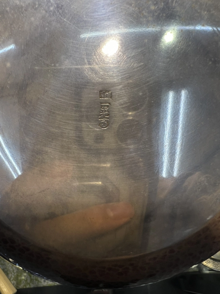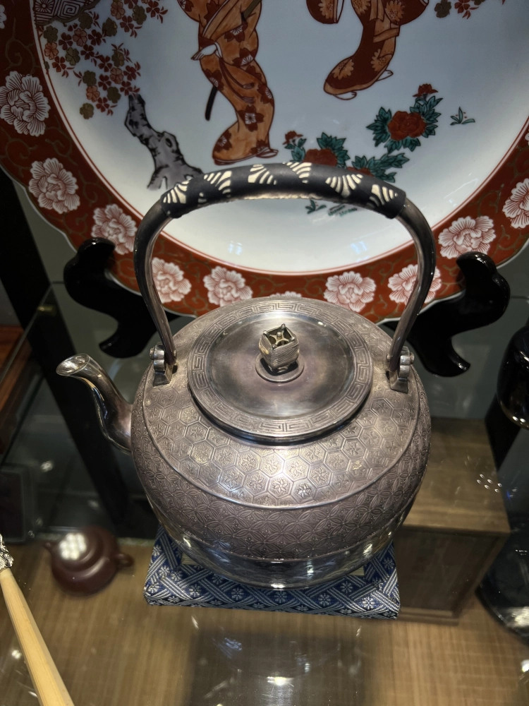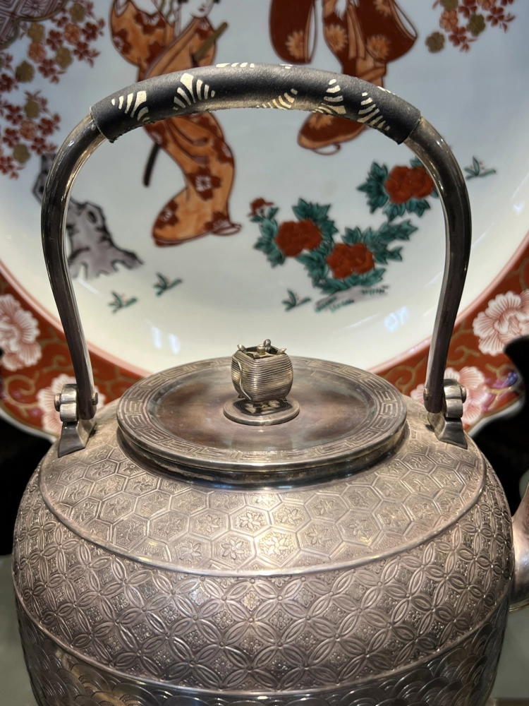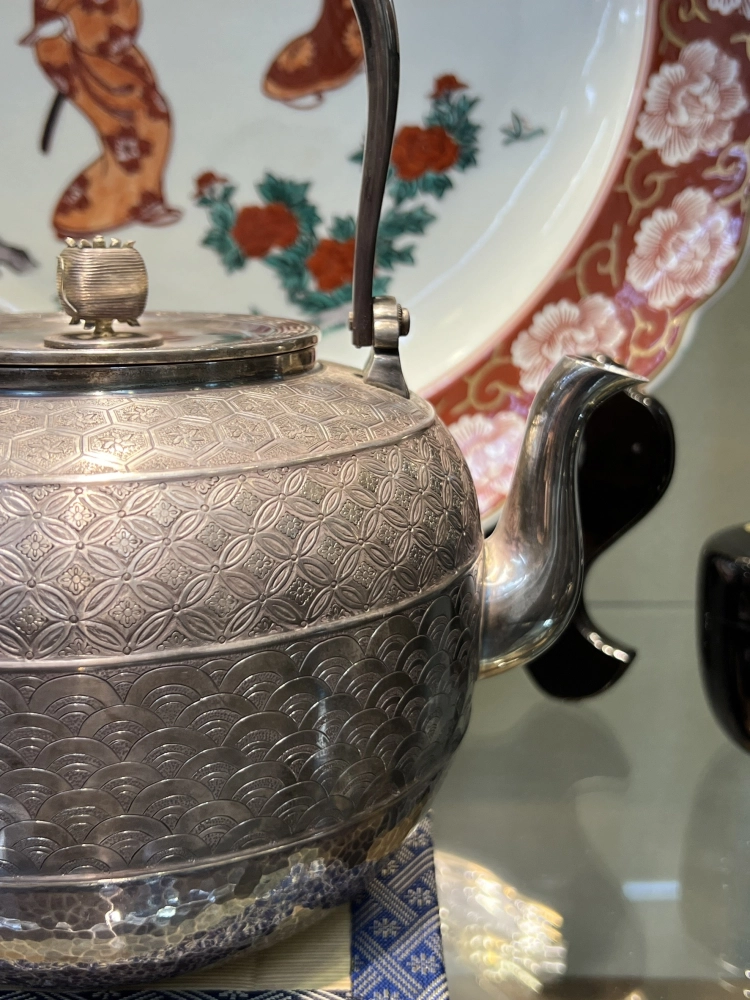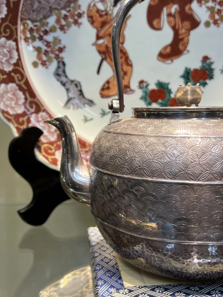 • 明治一晃齋作 燻紫手打金襴模樣 純銀湯沸
