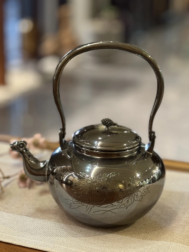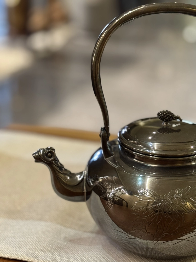 • 獸口雕花鳥 毬果摘 純銀湯沸