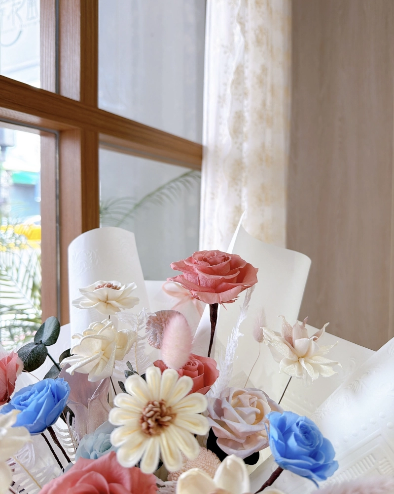 做.作 花室製作花禮的玫瑰花與葉子花材…等,皆來自於日本大地農園;溫柔的對待可存放1-2年。