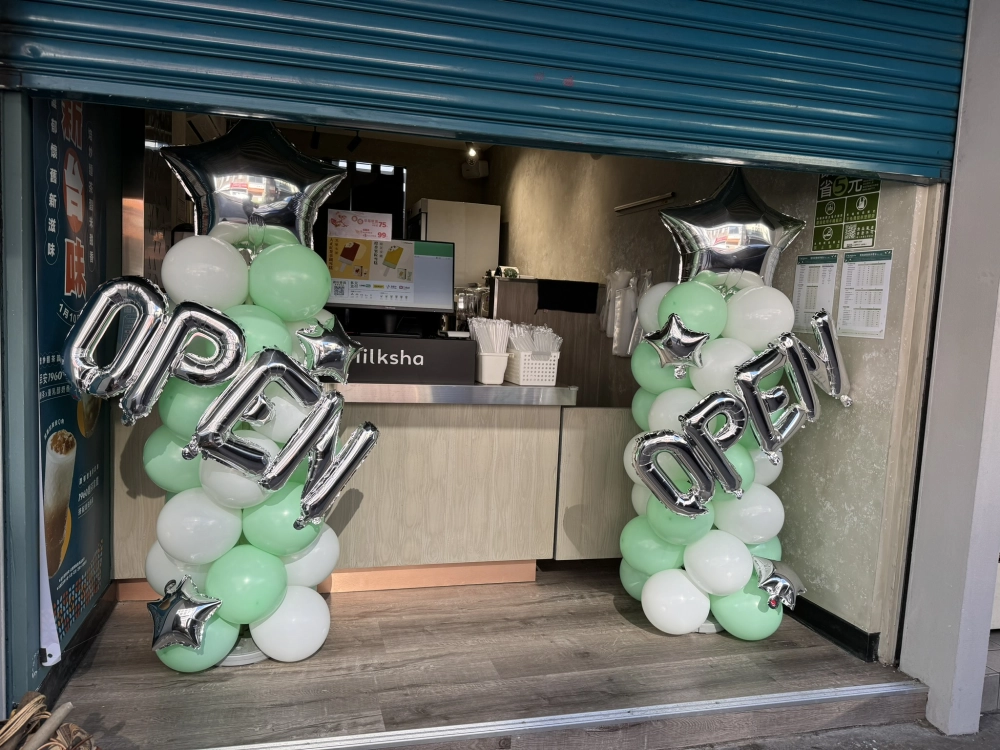 🔠 OPEN 字母氣球: 這是整組佈置的靈魂!銀色鋁箔字母,直接了當地傳遞開幕喜訊,高調又充滿現代感。