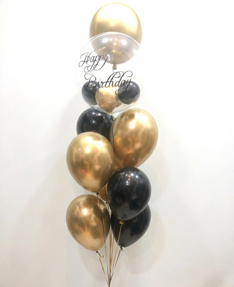 🔮 精緻水晶泡泡球: 頂端的透明泡泡球不僅印有優雅的 "Happy Birthday" 英文字體,球中更巧妙包裹著黑金雙色的小氣球,層次感極佳,細節滿分!