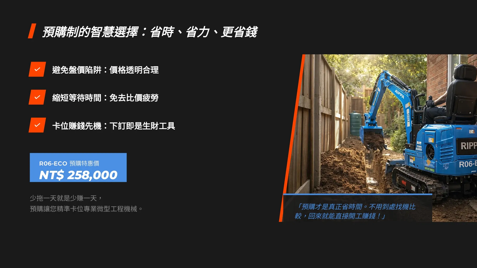 ◆立派 RIPPA R06 微挖,輕巧、有力,是您省時、省力、創業賺錢的好幫手!