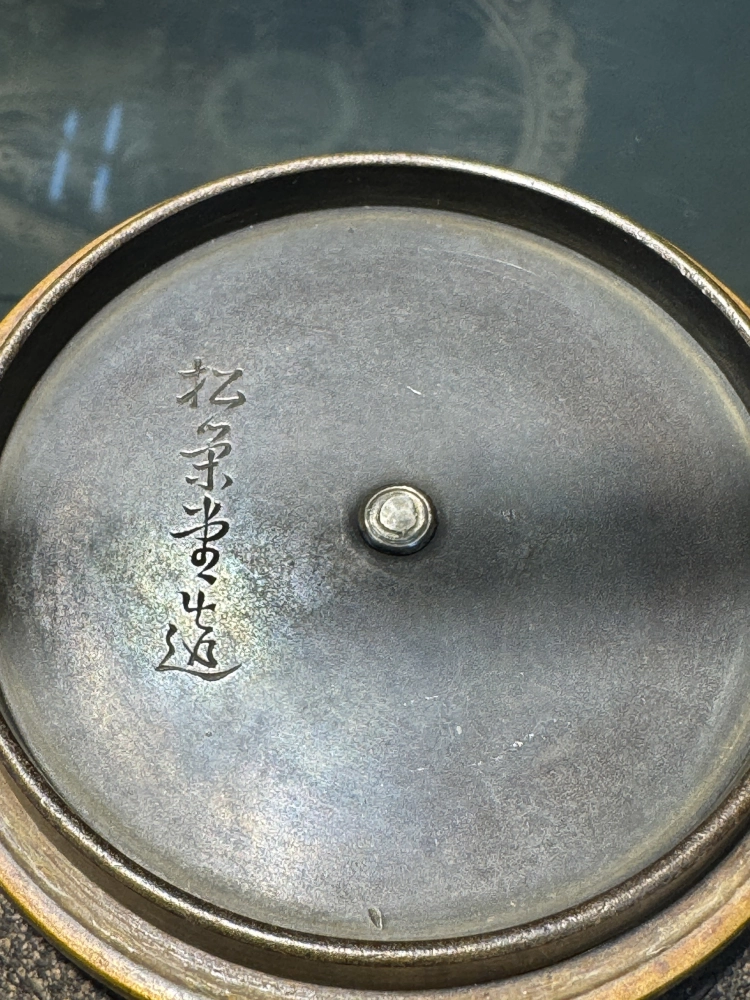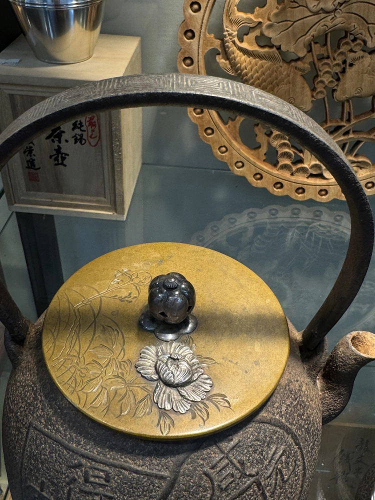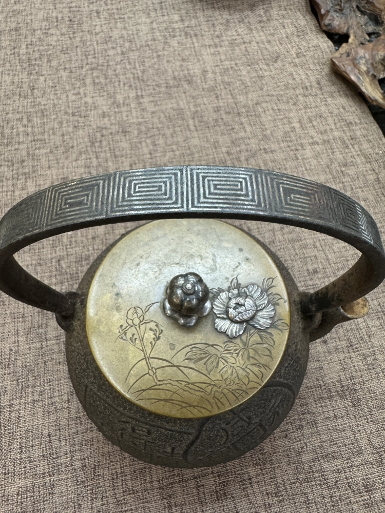 • 松榮堂作 古錢紋銀紋把銀摘 銀鑲嵌牡丹蓋老鐵瓶