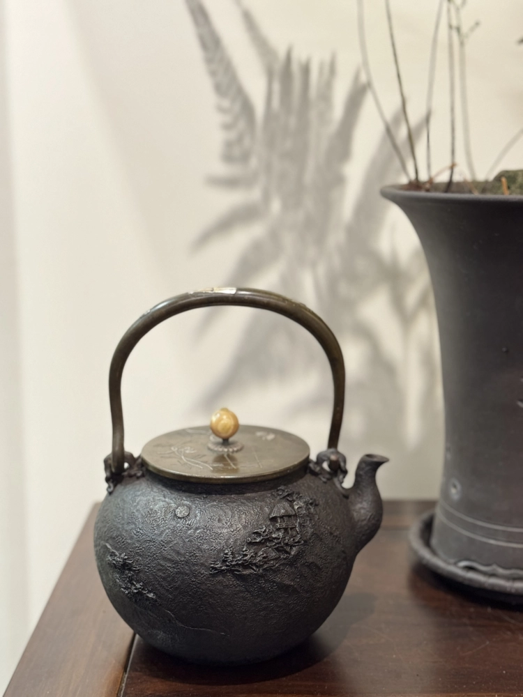龜文堂 山水家屋 花蝴蝶嵌銀蓋 嵌銀把 老鐵壺